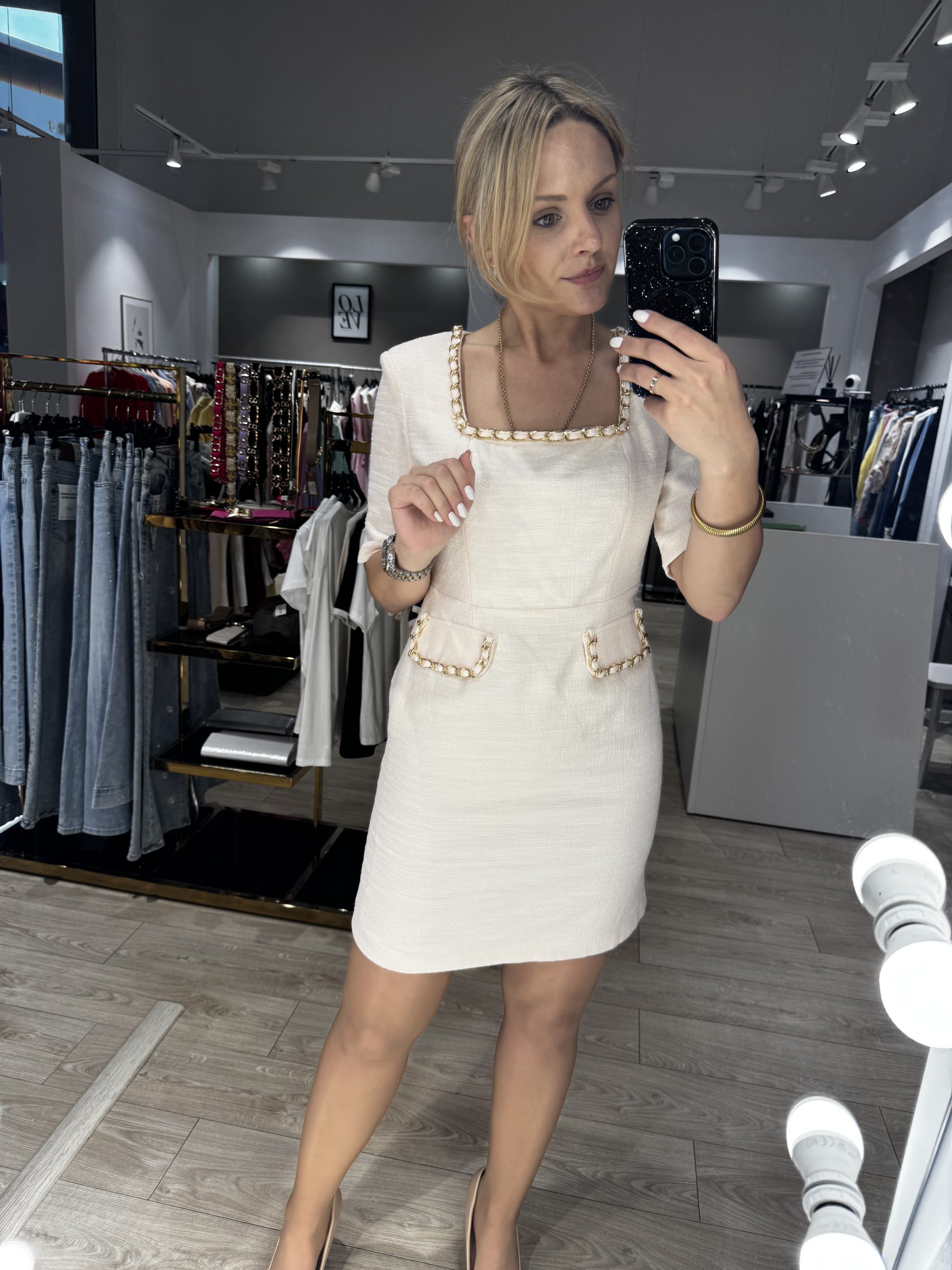 Charakterystyczne dla stylu Chanel detale – lekko rozkloszowany dół, ozdobne guziki i kontrastujący kołnierzyk – sprawiają, że sukienka prezentuje się szykownie i z klasą.