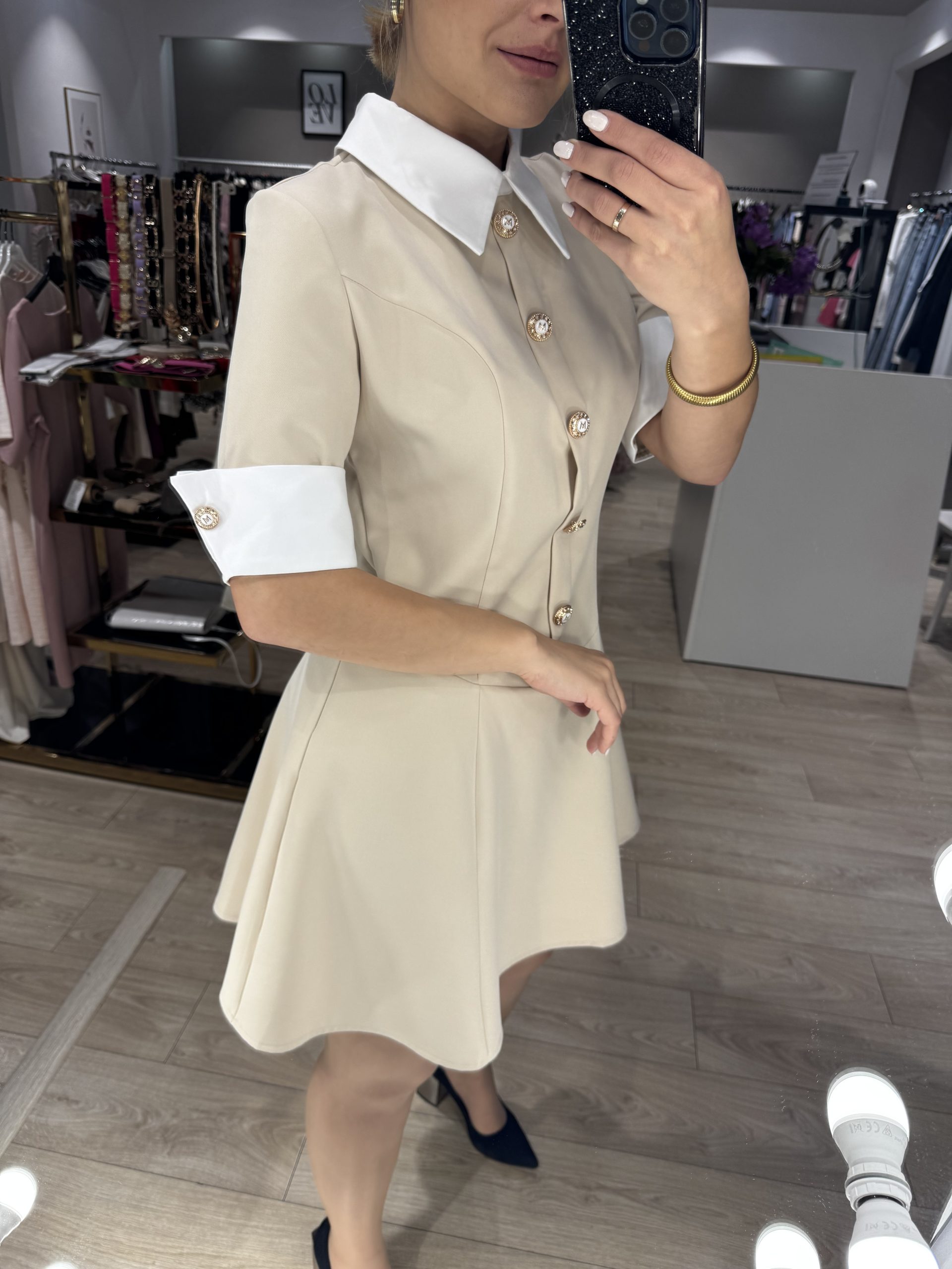 Beżowy kolor pięknie komponuje się z kontrastującymi, białymi mankietami i kołnierzykiem, tworząc klasyczny, ponadczasowy look.